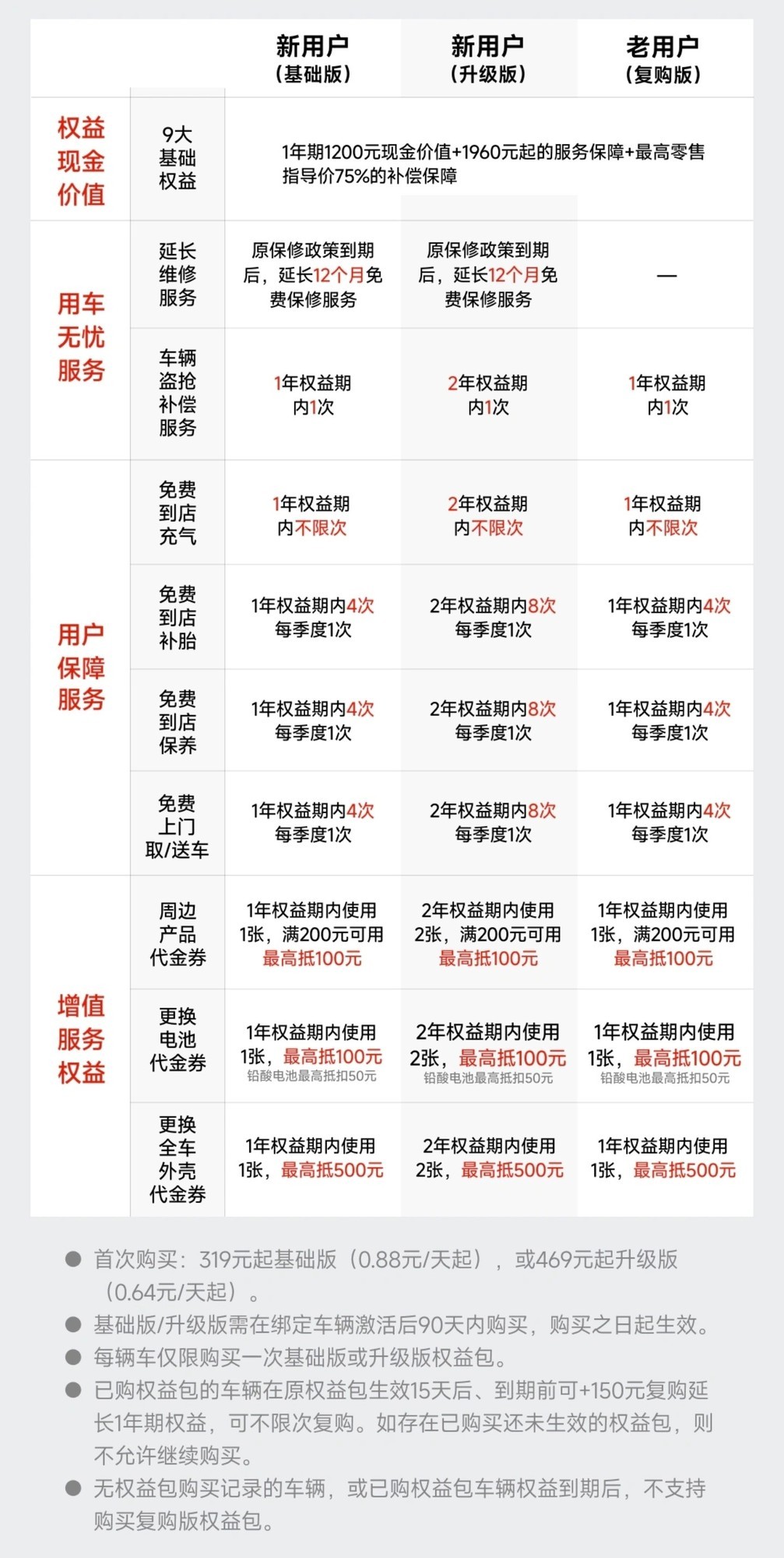 具体服务内容包括:12个月延长维修服务;车辆被盗或被抢时,可获得最高达零售指导价75%的补偿保障;提供不限次数的免费到店充气服务,长期有效;在权益有效期内,每年可享受4次保外到店免费补胎;每年还可享受4次到店基础保养;每年提供4次免费上门取送车服务;同时赠送9折到店周边产品代金券,单笔消费满200元即可使用;另有9折保外更换电池代金券;以及8.8折更换全车外壳代金券,单次优惠最高可抵500元。