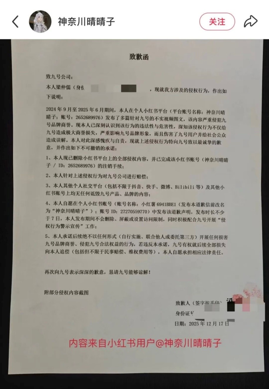 (图为“黑水军”账号“神奈川晴晴子”公开致歉函截图)