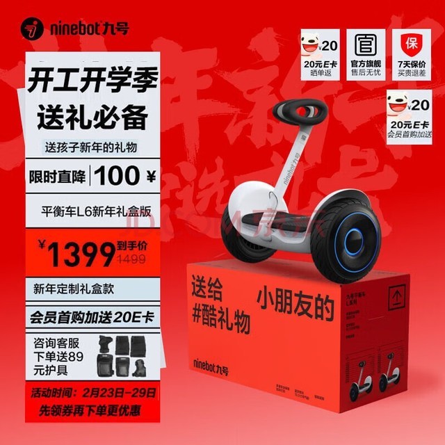 首先是九号品牌推出的电动平衡车L系列儿童平衡车智能思维车双轮9号电动车成人体感车手控腿控车平车L6礼盒版【龙年新年定制礼盒】。此款产品已售出逾万件,近一周内的销售额将近百台。其独特之处在于以龙年新年定制礼盒包装,赋予礼品更多情感价值。除此之外,产品配备十五重安全措施及二十九项严谨测试,保证使用者安全性。参数方面,可行驶距离达十公里,轮胎类型为充气胎,刹车方式为体感刹车,最高时速为十二公里/小时,承重大约70公斤,电池容量约为102瓦特小时,提供一键启动和停车功能。